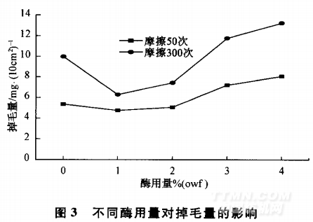 图3是经过不同用量的酶液处理30 min后织 物掉毛量的变化情况。由图3可知,在酶用量为 1%(owf)时,织物的掉毛量最少,而随着酶用量的增 加,织物的掉毛量反而有所增加,当酶用量超过 2%(owf)以后,织物的掉毛量增加迅速,甚至超过 了未经酶处理的织物。这是因为酶的刻蚀作用在 增加纤维间静摩擦因数的同时,也对纤维的强力 造成了破坏,虽然由于滑脱造成的掉毛有所减少, 但是由于纤维强力降低,摩擦过程中发生断裂掉 毛却在增加。