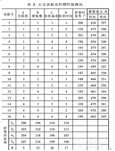 联剂质量浓度;影响织物强力的因素顺序是焙烘温度>焙烘时间>交联剂质量浓度>聚氨酯质量浓度。焙烘时间和焙烘温度对织物的强力影响很大,延长焙烘时间,提高焙烘温度均会使织物强力(特别是纬向强力)显著下降,而且焙烘温度越高、时间越长,织物泛黄越严重。综合考虑织物强力和折皱回复性能,在保证织物一定强力保持率的前提下,织物聚氨酯整理的最佳工艺条件为A1B3C2D2,即交联剂10 g/L,聚氨酯100 g/L,焙烘温度140℃,焙烘时间3 min。整理工艺中交联剂改性2D树脂的用量远低于树脂整理的用量,从而减少了织物表面游离甲醛的含量。