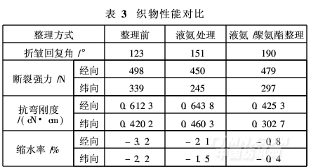 采用上述优化的聚氨酯整理工艺条件对薄型高支苎麻织物进行整理,测定织物各项性能,结果见表3。