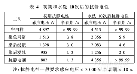 而且具有较好的耐洗性。其中,采用染后浸轧法效果最优(表4)。TF-620与抗静电剂相比具有以下优点: