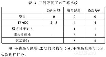 (2)吸湿排汗剂TF-620可改善织物的润滑性,防止擦伤和鸡爪印的产生。若采用染后浸渍或染后浸轧,织物的手感更为蓬松和柔软,较部分亲水性硅油好,与氨基硅油相差不