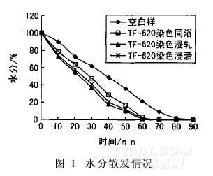 经吸湿排汗剂TF-620整理后,涤纶织物上的水分散发明显加快,它是通过提高织物的吸湿性和导湿速度获得的。其中,染后浸渍或染后浸轧法效果更佳(图1)。