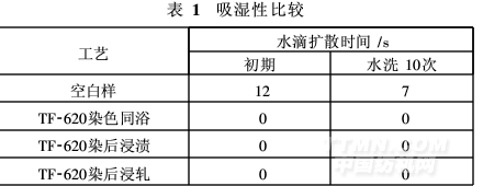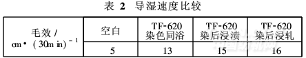涤纶的吸湿性和导湿速度都较差,当人体出汗时,很难将汗液及时排出,感觉发闷。而采用吸湿排汗剂,无论是采用染色同浴、染后浸渍或染后浸轧法,都具有优异的吸湿性和导湿性(表2)。