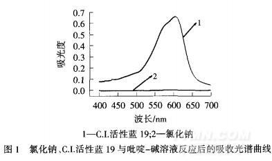 比色法试验具有专一性,为了排除游离氯离子或者硫酸酯乙基砜与吡啶一碱溶液起反应而对试验造成干扰,研究了氯化钠、硫酸酯乙基砜染料(C.I.活性蓝l9)[2]与吡啶一碱溶液在50cc反应0~1h后的吸收光谱变化,结果如图1所示.