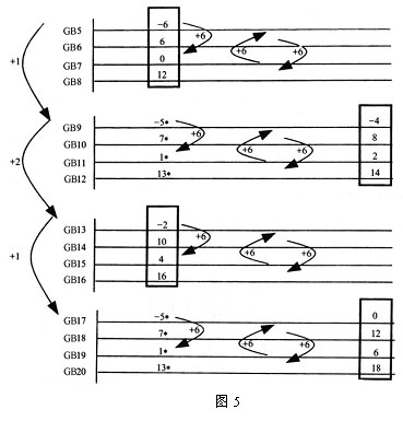 在本例中,结果在1到2之间。在这种情况下,1和2将交替被增加。图5显示在所有花梳根据上面两个计算值怎样得到零位。第一把花梳GB5的零位根据经验来确定,本例中GB5=-6。