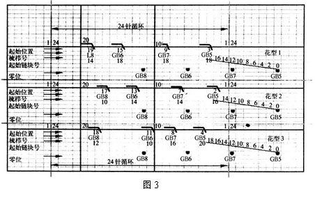 如图3所示,使用相同的花纹宽度,如果所有导纱梳根据相同的横移线来划分,机器在花型改变的时候就不需要重新设置或重新穿纱。在系列花型中,每把梳栉从零位开始最大横移一般为36针,为通常47针横移的三分之二。在不改变零位的情况下,当然也可以把横移运动扩大到47针。
