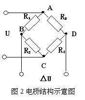 电桥按 120Ω设计,在电桥盒内有两个120Ω精密无感线绕电阻作为半桥测量时的内半桥, 外半桥采用两片等阻值的工作电阻应变计 ,结构如图 2所示。U为供桥电压;△U为输出电压;R 1 和R 2 为测量时外接应变电阻计;R 3 和R 4 为内桥电阻。 检测头为一受力传感器,采用一端固定梁式结构,梁的正反面中央各贴一片工作电阻应变计。 电阻应变计由极细的金属电阻丝用粘贴剂牢固地贴在试件上,或用金属箔片印刷在试件上 [3] 。