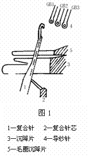 下面以KS3P为例来介绍毛圈的形成。如图1所示,生产毛圈织物时,GB3始终与毛圈沉降片作同向横移,这样GB3的纱线垫在毛圈沉降片的下面形成底布,而GB1、GB2的纱线在编织过程中垫放到毛圈沉降片上面,形成毛圈,在接下来的后整理过程中,毛圈被剪开成为毛绒,常称为剪割丝绒。显然经编毛圈织物至少需要两把梳栉,一把梳栉编织底布,一把梳栉编织毛圈。毛圈沉降片像普通梳栉一样用球轴承支承在导向架上,装在普通沉降片上方,在成圈过程中它不作前后运动,仅由编花轮或模块控制作一针距的横移运动。毛圈沉降片的横移将其所握持的延展线向左或向右推移了一个针距,因为毛圈的形成与否将取决于导纱针的垫纱运动方式。