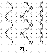 另外,由于底布是采用经平组织,而前梳编链组织形成毛圈,在横向没有联系,因此织物横向受拉伸时,如后梳有断纱就会脱散,因此定形时,破洞之间要用线缝好,防止通匹撕布。改善这种脱散现象的方法是:a.采用两把梳栉编织底布,b.更换地组织,如图5所示,这样毛圈沉降片也相应改变。