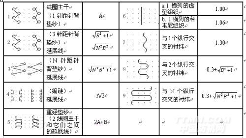 首先用A、B参数计算经编组织的线圈估算单位数。构成经编基本结构的各垫纱要素如图1所示,对于各要素给出了横列间隔为1时的单位数值或简单式子,它们分别由理论或实验方法求得(参数A、B可以根据机号、纵密、原料粗细查表所得)。