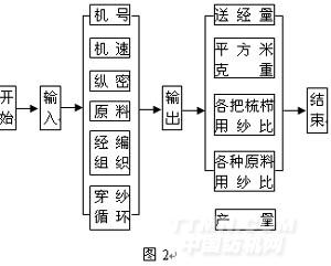以上述理论为基础进行了编程,程序运行在windows98下,采用了VB5.0这种高效、简单的编程语言,程序框图如图2所示。因计算机辅助经编工艺计算是经编织物CAD系统的一个程序,关于经编组织以及穿经循坏的数学模型等由于篇幅有限,这里不再描述。