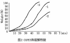 海岛型超细纤维是在制成织物后把海组分溶解掉,留下岛组分而形成连续不断的超细纤维织物的。因此海组分的溶解性能对经编麂皮绒的效果至关重要。水溶性聚酯(COPET)在水中的溶解符合先溶胀后溶解的规律。水溶性聚酯(COPET)的组成、结构、分子量及外部条件均对溶解有一定的影响,外部条件对水溶性聚酯(COPET)的溶解的影响如图2所示。曲线1为水溶性聚酯在95℃的热水中的溶解。它先以溶解为主;曲线2为水溶性聚酯在95℃下,0.5%NaOH水溶液中的溶解情况,它也有一个溶胀溶解过程,但溶胀较慢,溶解最后还有残留物,这可能是由于Na+、OH―离子的存在,破坏了高聚物的溶解平衡,使溶解速度变得较慢,另外NaOH也与聚合物中的一些成分产生了反应,生成了沉淀,曲线3为水溶性聚酯在95℃下含0.5% NaOH,1g/L 1227促进剂水溶液中的溶解情况,由于在水中加入了1227表面活性剂,因而,水溶性聚酯在溶胀的同时表面也发生了水解,变成小分子而促进了水解的进行,使溶解速度加快。并且可根据不同情况调整NaOH的百分含量来控制溶解速度。