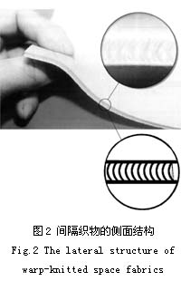 经编间隔织物间隔系统的单丝或纱线参与两个表层的编织,轮流在两个针床上作针前垫纱,由一把梳栉编织或由两把梳栉反向编织,在一个针床上形成一个线圈后并转移到另一个针床上形成线圈。 实际上, 这个贯穿于上下两个表层之间的间隔丝(纱)就是这两个线圈间的延展线,起到连接和支撑作用,如图1所示。从织物的侧面(见图2)看, 由于这些延展线力图伸直而略呈弓形,并与织物表层成一个很小的角度。为使间隔层更加稳定,可在间隔层中引入衬经纱和衬纬纱,充实间隔层中的空隙。引入的衬经纱和衬纬纱还可与间隔纱互相交织,使结构更加稳定