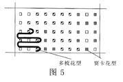 在进行多梳贾卡复合机型的花型设计时,与普通多梳花型设计基本相似。贾卡花型直接描绘在多梳意匠纸上或在透明的方格纸上。这样,就可得到多梳和贾卡组合的花型,如图5所示。另外,为了避免花型断裂,必须保证花型高度和宽度可以被地组织循环除尽。