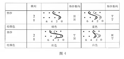 在织物上红色形成“厚”组织,蓝色和绿色形成“薄”组织,白色形成“网眼”组织。贾卡梳栉的偏移由“H”和“T”表示。其中“H”表示没有偏移,“T”表示有偏移。在新的匹艾州(Piezo)系统中,“T”表示“左接触”,“H”表示“右接触”,这里“接触”,表示接触贾卡导纱针两侧的定位块。