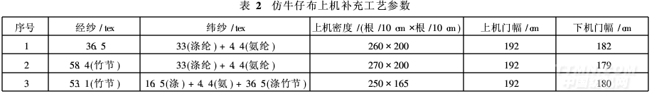 为便于比较两类产品的特点,表1仅给出部分坯布参数。实际上,在新品开发过程中,坯布上机的许多参数都是非常重要的,仿牛仔布的相关上机工艺参数补充见表2。