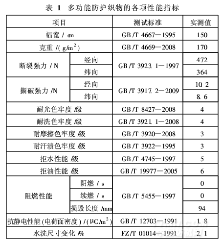 采用上述工艺生产的抗静电/阻燃/拒水拒油多功能防护织物的各项性能指标见表1。