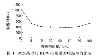 称取20 g亲水整理剂KL-WPS投入80 g水中,用水浴锅于45~50℃加热15 min,搅拌至固体完全溶解,即配制成含固量为20%的亲水整理剂KL-WPS溶液,待用。