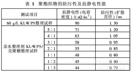 聚酯织物经壳聚糖与亲水整理剂KL-WPS的复配液整理后,测试防污性和抗静电性,结果见表1。