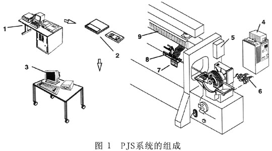 如图1所示,PJS系统由花纹设计计算机1、花纹数据存储器2、终端3、花纹控制计算机4、接收器5、触发盘6、Piezo贾卡元件7、Piezo贾卡梳栉(JB)8和BW-SAP纹板9组成。花纹数据通过花纹计算机(1)来设计,并存储到一个软盘(2)上。花纹数据通过终端在花纹控制计算机(MS-Computer)(4)中读出。Piezo贾卡系统同时对针织元件作用,经编机主轴带动触发盘(6),向控制计算机发出主轴每一转信号。控制计算机得到主轴每一转信号(新的针织横列)后,发送一个控制脉冲到接收器(5)。接收器通过BW-SAP纹板(9)传送这个脉冲到Piezo贾卡梳栉(8)上的Piezo贾卡元件(7)。
