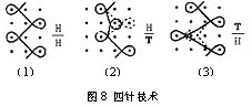 贾卡导纱针在针背横移时没有偏移,作闭口2×1组织1-0/2-3。在织物表面形成“薄”花纹效应,如图8(1)所示。
