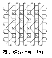 双轴向经编织物结构如图2所示,由纬纱、经纱和成圈纱组成。经纱处于纬纱和成圈纱延展线之间。