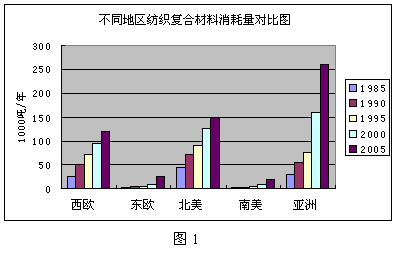 纺织复合材料通常由一种基质材料与一种增强织物复合而成。它既保留了复合前各组成材料的优点,又具有其各组成成分所不具有的新的性能,是一种新颖的工程材料,具有极大的发展空间,这一点可从纺织复合材料的消耗量图表得到证实(图 1)。