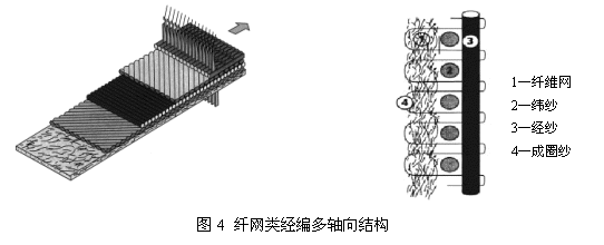 图4为带有纤维网的多轴向织物。 在经编结构中可织入预先粘合的纤维网,这种经编增强结构具有很更广泛的用途。例如,在易于沉陷区域和滑坡区域修建安全区,纤维网可防止泥土和碎石的泄漏或滑坡。