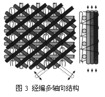 多轴向经编织物结构如图3所示,由纬纱、经纱、两个斜向衬纬的纱线和成圈纱组成。 衬经纱承受着轴向的单向载荷;而水平衬入的纬纱可阻碍纱线的侧滑聚集,同时,衬纬纱还能将横向承受力的一部分转移到经纬纱交织点处,由此形成纵向定向连接的条带。 注意它们之间层次关系,纬纱处于最低层,其次经纱、然后为两个斜向衬纬的纱线,它们的衬入角度分别是 +45 ° /-45 ° /0 ° /90 °。