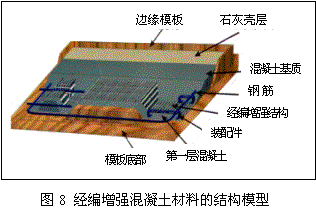 在研究开发过程中,一种比较理想的混凝土材料构造如图 8所示。虽然成品的结构由于它们不同的用途而外表不同,但其内部的各个层次一样。在板材实际使用之前,对 2.5m × 1.5m 的建筑构件进行实验,结果表明经过经编结构增强后的材料承载能力非常优异。在生产过程中,每个建筑构件中使用的增强纺织品的总量大约是 15m2 。