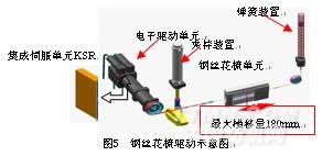 如图 5 所示,钢丝花梳一端通过连接带与伺服驱动单元相连,另一端与反向平衡装置连接,在靠近伺服驱动单元处使用一夹持装置以防止钢丝梳横移路径的偏移,伺服电机的正反向旋转导致了钢丝花梳的来回横移,电机顺时针旋转时,钢丝花梳经过夹持装置向左横移;同时反向平衡装置内的气压活塞下移,反之,钢丝梳向右横移,气压活塞上移,反向平衡装置保证钢丝梳在横移过程中张力均匀一致。反向平衡装置是一个气压装置,相当于气压弹簧,与一般的弹簧相比,它对钢丝梳的作用更缓和,梳栉横移平稳、速度无急剧变化,无冲击。能保证钢丝精确的张力,且不会引起系统内的摩擦。