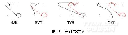 三针技术满机号(图 2 )和四针技术满机号(图 3 )是 RJPC 4F 经编机压纱贾卡技术中最基本的技术,这两种技术通过贾卡导纱针的偏移形成不同针距的垫纱,然后通过织针之间的偏移或不偏移进行结合,形成厚薄不一,并且具有明显层次效应的织物。