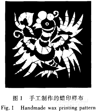 1.1 手工蜡印样布的制作蜡印样布制作工艺流程为:熔蜡一固定样布一起稿一画蜡一裂蜡一染色一固色一脱蜡一熨烫。制作手工蜡印的面料以本色棉布为主,一些高档蜡印产品也可采用蚕丝面料,本文选用常用的平纹棉布制作蜡印样布。所用蜡液质量配比为60%石蜡和40%蜂蜡;样布图案选择具有典型民族传统蜡印风格的装饰纹样,并用活性染料代替植物靛蓝进行染色。得到的手工蜡印图样如图1所示