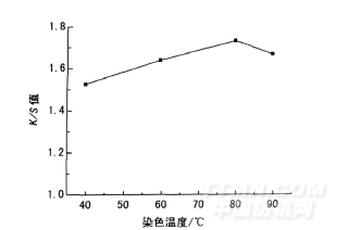 分别采用40,60,80和90℃对牛奶蛋白纤维针织物进行染色,织物的表观得色量随染色温度的变化如图5所示。