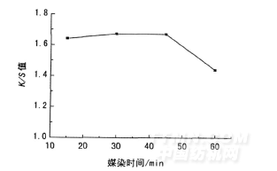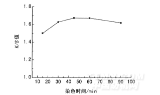 在染色时间分别为15,30,45,60和90min时,织物的表观得色量随染色时间的变化见图4。