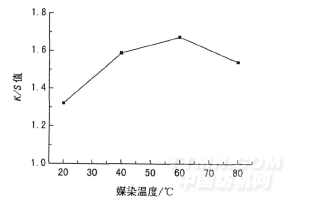 选用明矾为媒染剂,媒染温度分别为20,40,60和80℃,织物表观得色量随媒染温度的变化见图3。