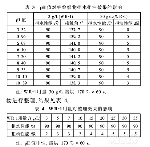 由表3可知, pH值的变化对锦纶拒水效果的影响不显著,但对拒油效果的影响明显。当pH值在3左右时,拒油效果基本没有;当pH值大于10时,拒油效果逐渐下降。因此,WR-1工作液近中性时,拒水拒油整理效果最佳。