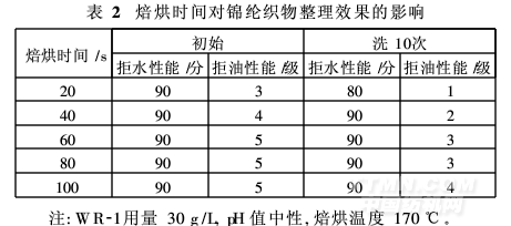由表2可知,延长焙烘时间,含氟整理剂WR-1在锦纶织物上的交联程度逐渐提高,织物的拒水、拒油及耐洗效果提高。焙烘60 s后,继续增加焙烘时间对拒水拒油及耐洗效果影响不大,且长时间焙烘会使织物产生黄变,因此确定焙烘时间为60 s。