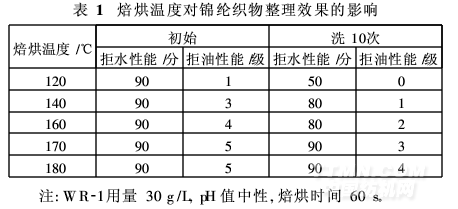 焙烘温度对WR-1在织物上的成膜性有较大影响,进而影响织物的拒水拒油效果。改变焙烘温度,按