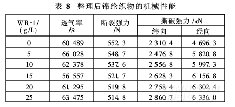 按优化工艺,以不同用量整理剂WR-1整理锦纶,整理织物的各项性能见表8。