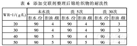 (4)对于耐洗性要求较高的拒水拒油产品,整理工作液中可添加适量的交联剂(用量为WR-1的15% )。