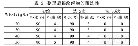 将经不同用量整理剂WR-1整理后的织物按1. 4节(6)进行耐洗性试验,结果见表5。