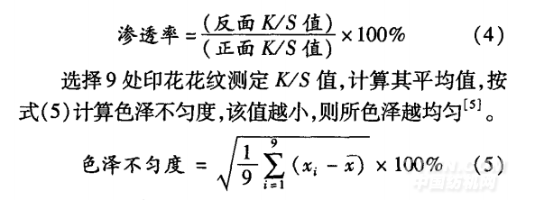 分别用活性红RES、活性黄3RS和活性翠蓝RES在平纹棉织物上印花,用UltraScan XE型分光测色仪 测定织物花纹处的K/S值。由正反面的K/S值按式