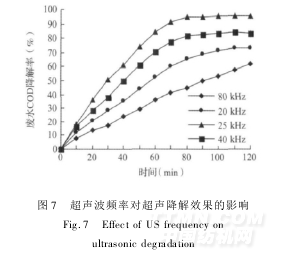 ( 3) 在一定实验条件下,催化剂投量、废水的pH、超声波频率都有一个最佳值。本实验结果是:当催化剂用量为1. 5 ~2 g/L,pH 为2.5,采用输出功率为1 W 和频率为25 kHz 的超声波照射COD为438 mg / L 的活性红染料废水,80 min 的COD 降解率可达95%,基本可以彻底矿化废水中的有机物。
