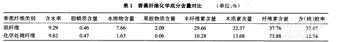 香蕉麻原纤维的化学成分:主要是由纤维素、半纤 维素、木质素和果胶等物质组成,其纤维素含量相对亚 麻和黄麻较低,半纤维素与木质素含量较高,故纤维的 光泽、柔软性、弹性和可纺性等均稍逊于亚麻和黄麻。 香蕉纤维化学成分含量测试按照GB 5889—86《苎 麻化学成分定量分析方法》规定进行,本地香蕉纤维的 测试结果如表1所示。