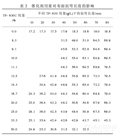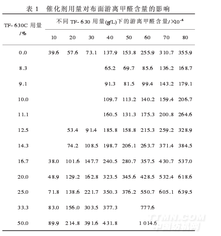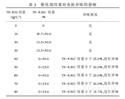 从表1~表3可看出,TF-630C用量应控制在一定范围内.随着TF-630用量的变化,TF-630C用量也应相应调整.原因是合适的催化剂用量可使TF-630在较短时间内充分反应,有效控制游离甲醛含量.如果催化剂用量偏小,会使反应不充分,导致游离甲醛含量增加.而催化剂用量偏大,则会使反应朝逆向进行,造成TF-630水解,游离甲醛含量也增加.TF-630C作为TF-630的催化剂,在配制时已充分考虑其化学反应活度(催化力),活度大可降低焙烘温度或缩短焙烘时间,完成交联作用.结合工厂应用情况,一般轻浆(TF-630 10~30 g/L)催化剂TF-630C用量为12.5%~25.0(对TF-630质量,下同);中浆(TF-63030~50g/L)为12.5%~20.0%;重浆(TF-630大于50 g/L)为10.0%~16.7%.