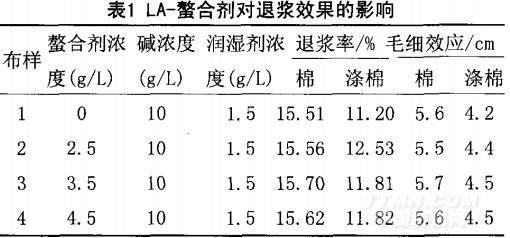 表1中的布样1是没有加入LA一螯合剂所测试的结果,通过布样l与其它布样的比较,可以发现,加入LA一螯合剂后纯棉织物的退浆率、毛细效应都有所提高。对涤棉织物也是一样,织物退浆率和毛细效应有一定的提高。这是因为目前退浆整理大部分都要用到碱,所