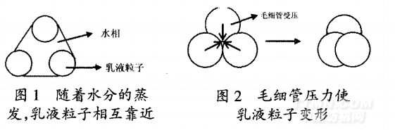 互相接近的乳液粒子之间产生毛细管现象,出现毛细管压强,促使毛细管变细;毛细管越细,压强越大,当毛细管压强大于乳液粒子的抗变型力的时候,乳液粒子就发生变形,如图2。