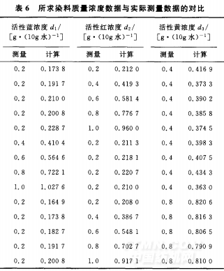 根据建立的数学模型,利用牛顿迭代法反求染料质量浓度,并与实际测量的染料质量浓度进行对比,其结果见表6所示。根据表6可以看出,根据建立的数学模型求出的RGB值与实际测量的RGB值之间的误差在误差允许范围之内。说明最小误差平均值拟合法能够较好地解决计算机染色配色的问题。