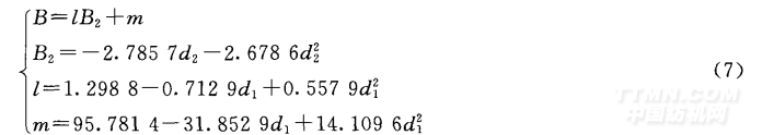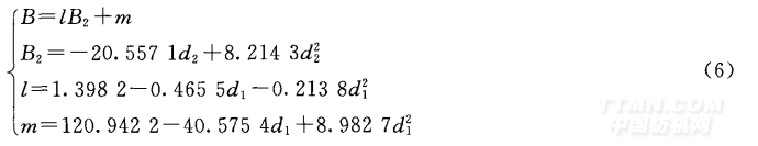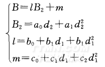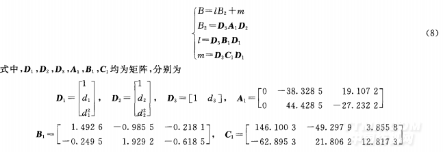 其中,a0,a1,b0,b1 ,b2 ,c0,c1 ,c2是关于d3的函数,可以求出各系数与d3的线性关系式。 综上可得,B与3种染料浓度的关系函数为